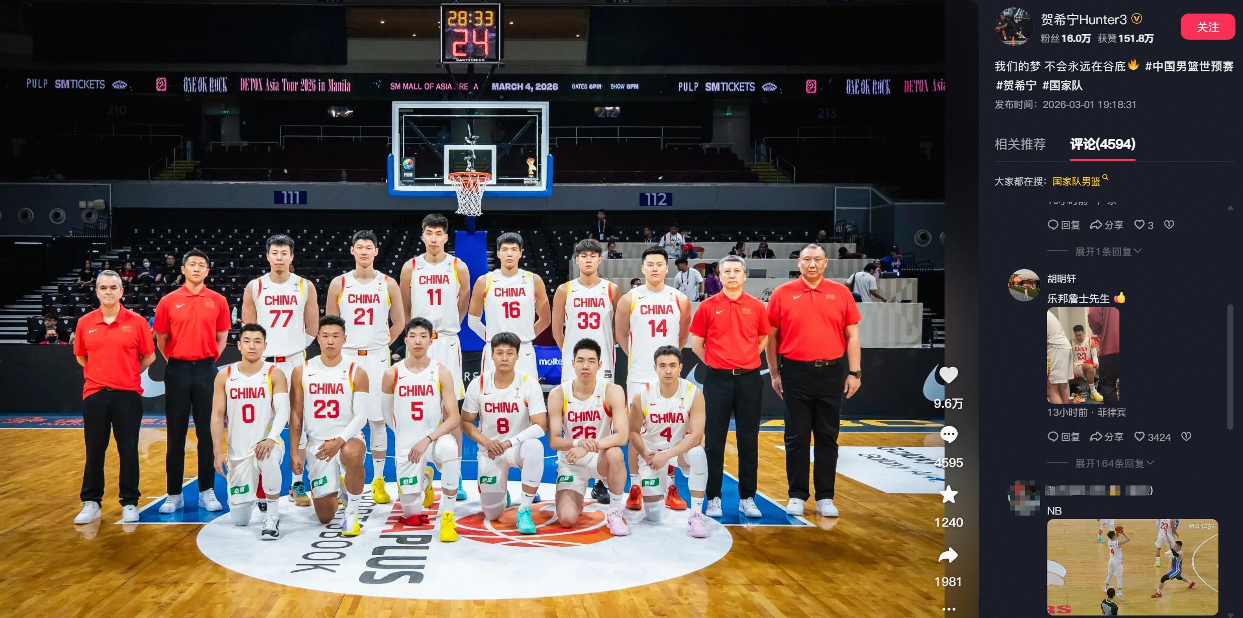 开云体育网页-贺希宁晒合影庆祝男篮胜利,胡明轩评论:乐邦詹士先生